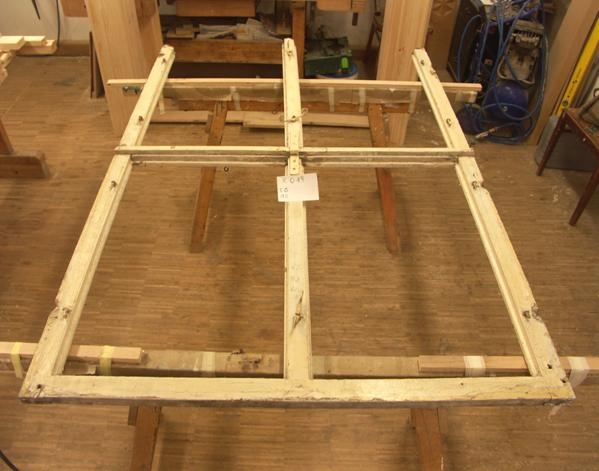 6. Einsetzen der Gläser mit Altglas. Sofern die originalen Glasscheiben des Fensters noch vorhanden sind, werden diese wieder eingekittet. Liegen die Fenster in einer Glasnut wird der Rahmen zunächst in seine Einzelteile zerlegt. Das Glas wird in die Nut des Rahmens in Leinölkitt gelegt und dann die Scheibe eingeschoben. Die Eckverbindungen der Rahmenteile werden vor den Sprossen zusammen gefügt.