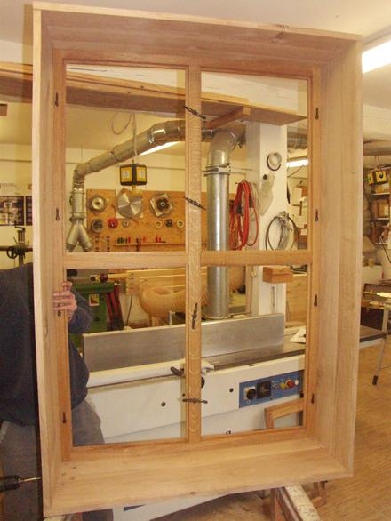 Danach wurden die Teile mit dem Hobel angepasst und geschliffen. Anschließend begann das Einsetzen der Gläser mit Altglas. Zur Untersuchung vorhandener Leckagen in der innenseitigen Dämmung der historischen Außenwände und der angestrebten weitestgehenden luftdichten Gebäudehülle zur Reduzierung des Kondensataustrittes im Konstruktionsquerschnitt erfolgte an einem Kastenfenster von Seiten des Ingenieurbüros Kriegenburg eine Untersuchung mittels Blower-Door bei 50 Pascal und zur Erkennung der Leckagen einer Infrarotkamera und Luftströmungsmessgerät (1). Die Blower-Door-Messung wurde nach Fertigstellung der "luftdichten Schicht im Gebäude" aber noch vor vollständiger Fertigstellung des Gebäudes durchgeführt. Im Vordergrund stand nicht der Nachweis der Mindestluftdichtheit des Gebäudes nach EnEV und DIN 4108-7, da dies bei Bestandsgebäuden nicht möglich und sinnvoll ist, sondern lediglich Leckagen und Wärmebrücken aufzuheben.