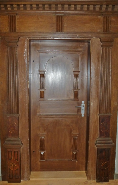 Abb. 29 Bauzeitliches, aufwändig geschnitztes Türblatt und der Nachbau dessen als Gesellenstück. Einbau vor Ort