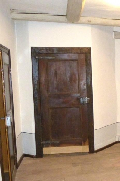 Eine weitere gestemmte Rahmenfüllungstür mit einer symmetrischen Teilung in zwei Füllungsfelder konnte der Türöffnung im Erdgeschoss des Wendelsteins zugewiesen werden. Barocke schmiedeeiserne Langbänder sorgen für die Drehbewegung der links angeschlagenen Tür.
